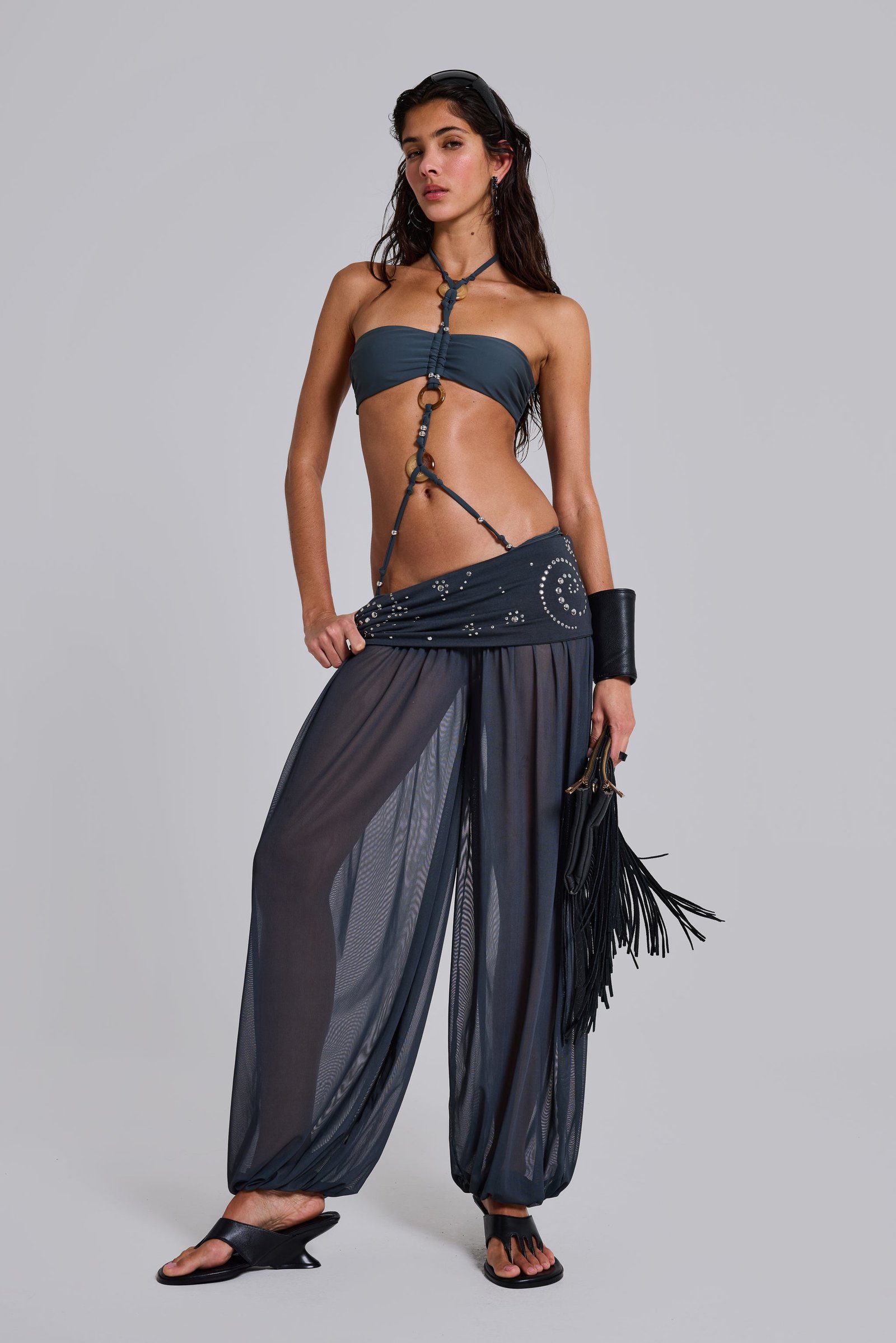 This resin trim swimsuit features a ruched bandeau silhouette designed to sculpt and flatter. Resin circle trims and bead detailing accent the centre front straps for a statement finish, while a halterneck tie allows for an adjustable fit. Fully lined for comfort and support, it fastens with a clasp at the centre back.