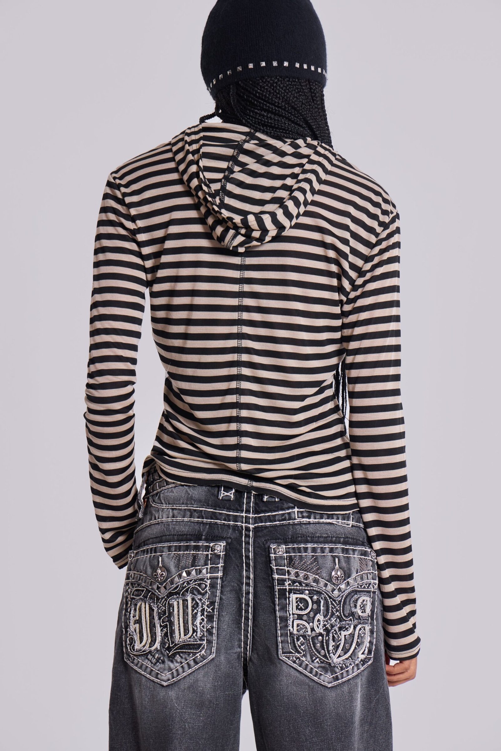 Stripe Mist Hoodie. A sheer lightweight jersey hooded top with beige and black stripe.