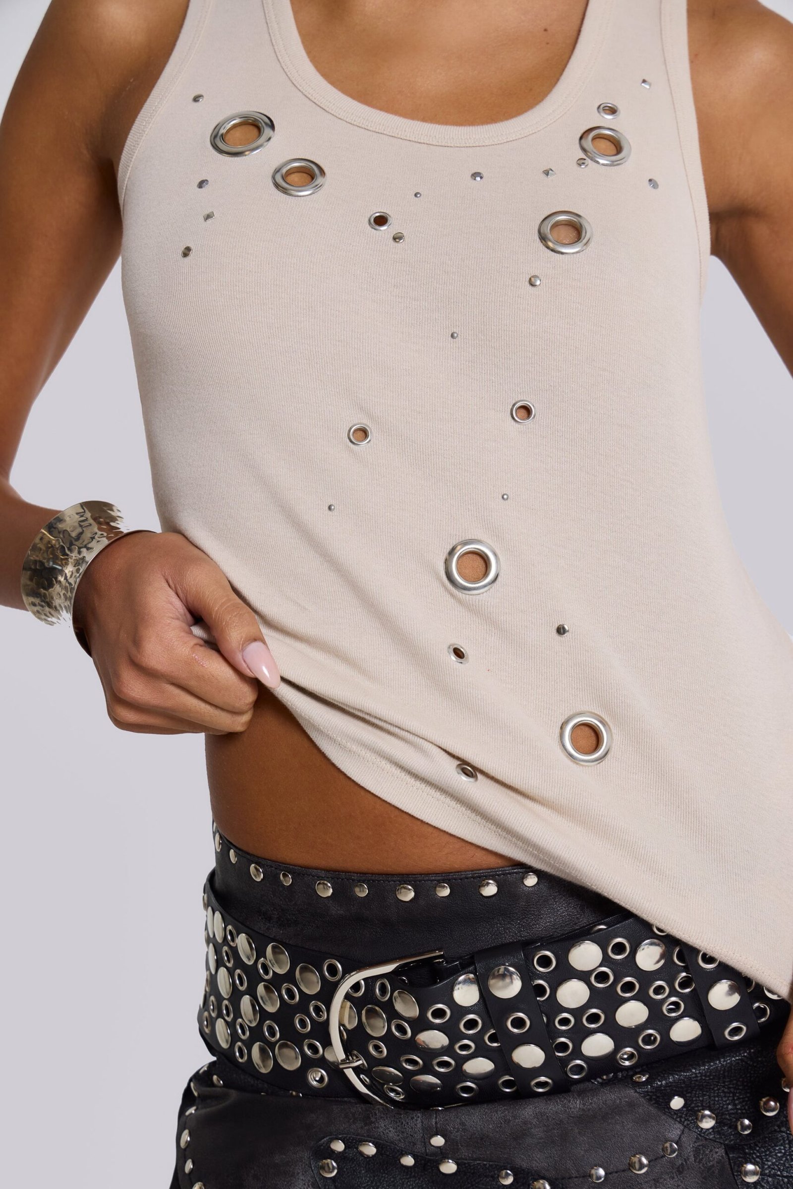 Eye Contact Vest Top With Eyelets. Jersey vest shape with cascading eyelets in varying sizes down front panel.