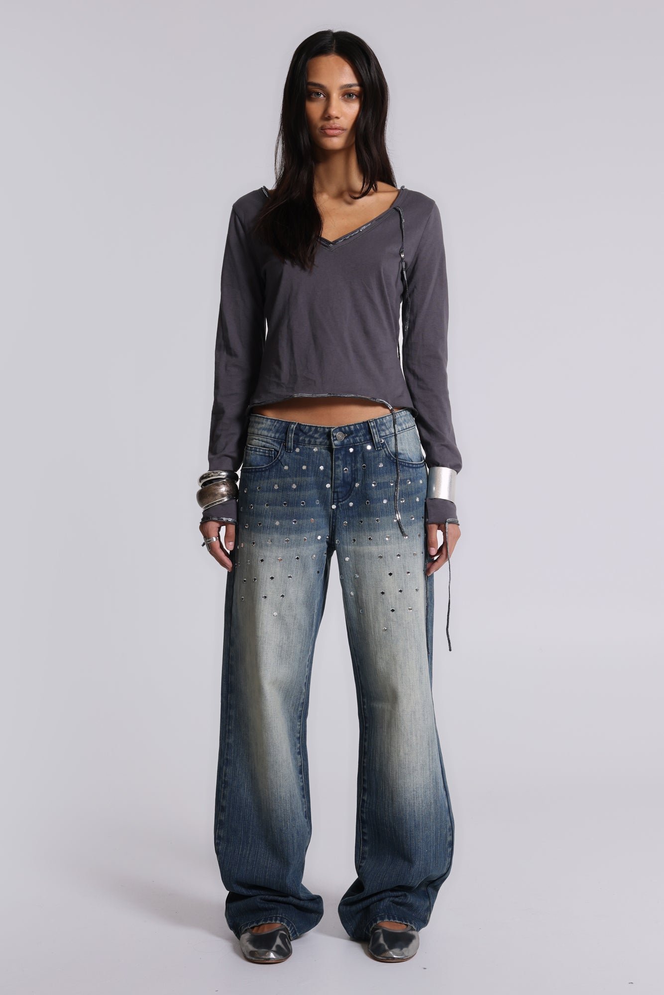 This easy-fit V-neck tee is designed with long sleeves and a striking backless silhouette. Finished in a grey colourway, it features sequin embellishment for subtle shine, balanced by raw-finished edges for a deconstructed feel. A strappy back design adds a statement finish, combining softness with edge.