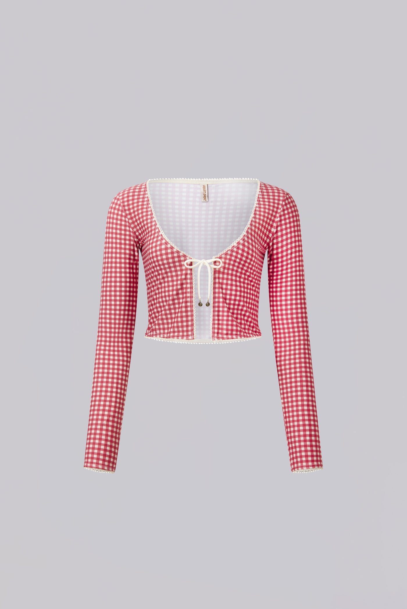 Red gingham print cardigan which features broderie edging and tie front.