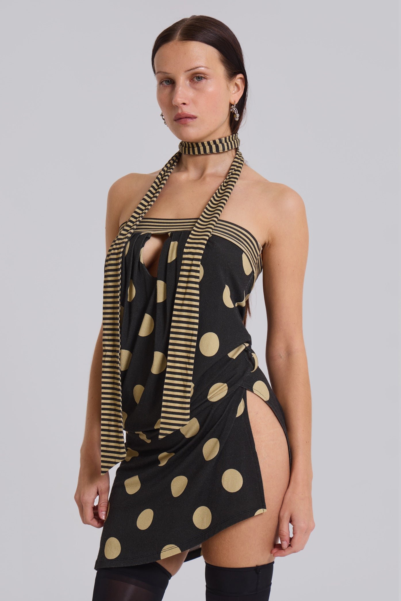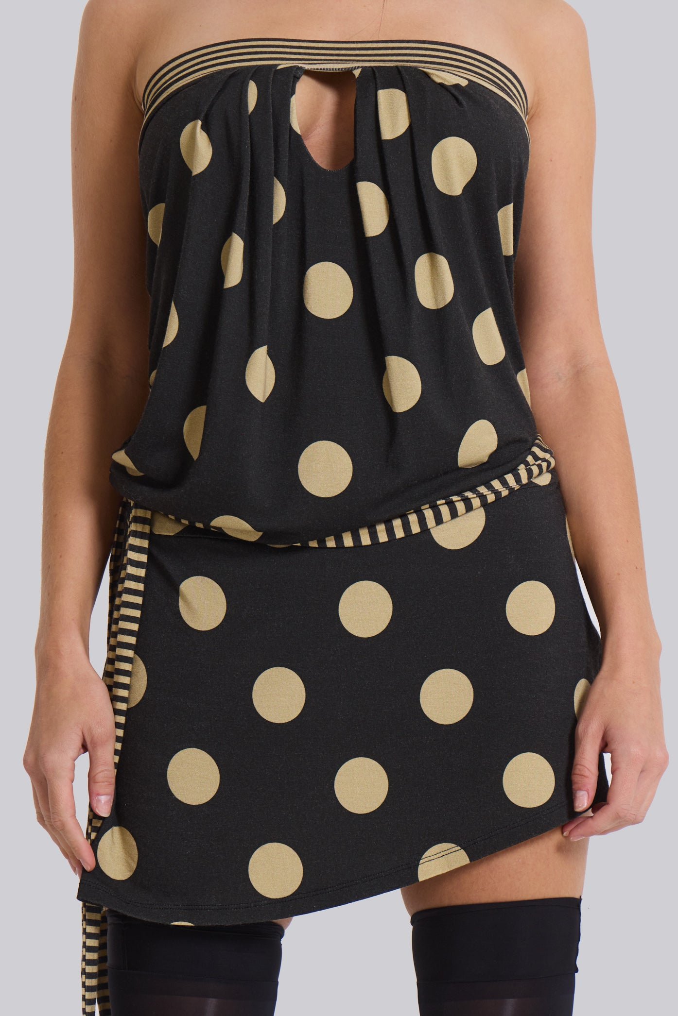 Contrast Polka Dot and Stripe Mini Dress. Draped strapless dress in jersey fabric. Tie at side can be worn multiway.