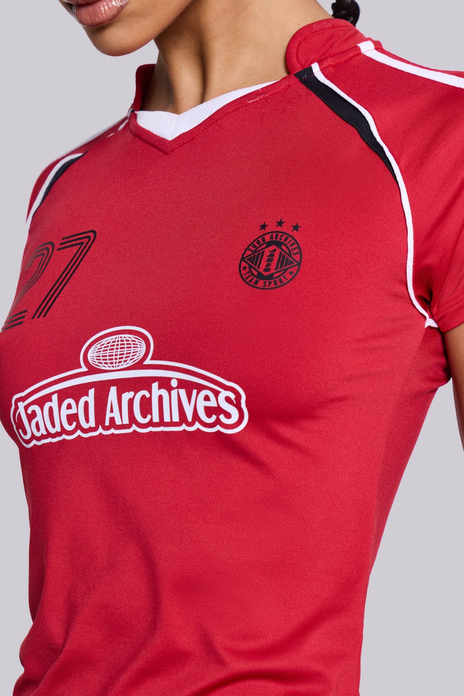 Jaded London | 2000Archives short-sleeve football baby tee with sporty collar and stripe details with printed logos front and back.