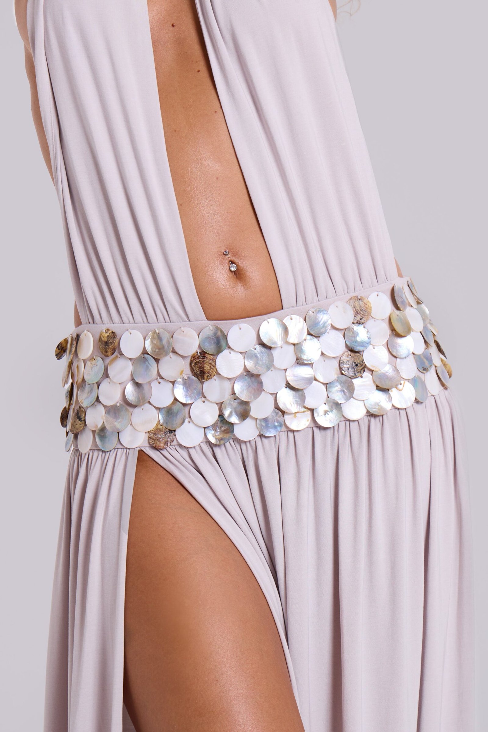 Stone plunge maxi dress with fixed natural shell belt detail