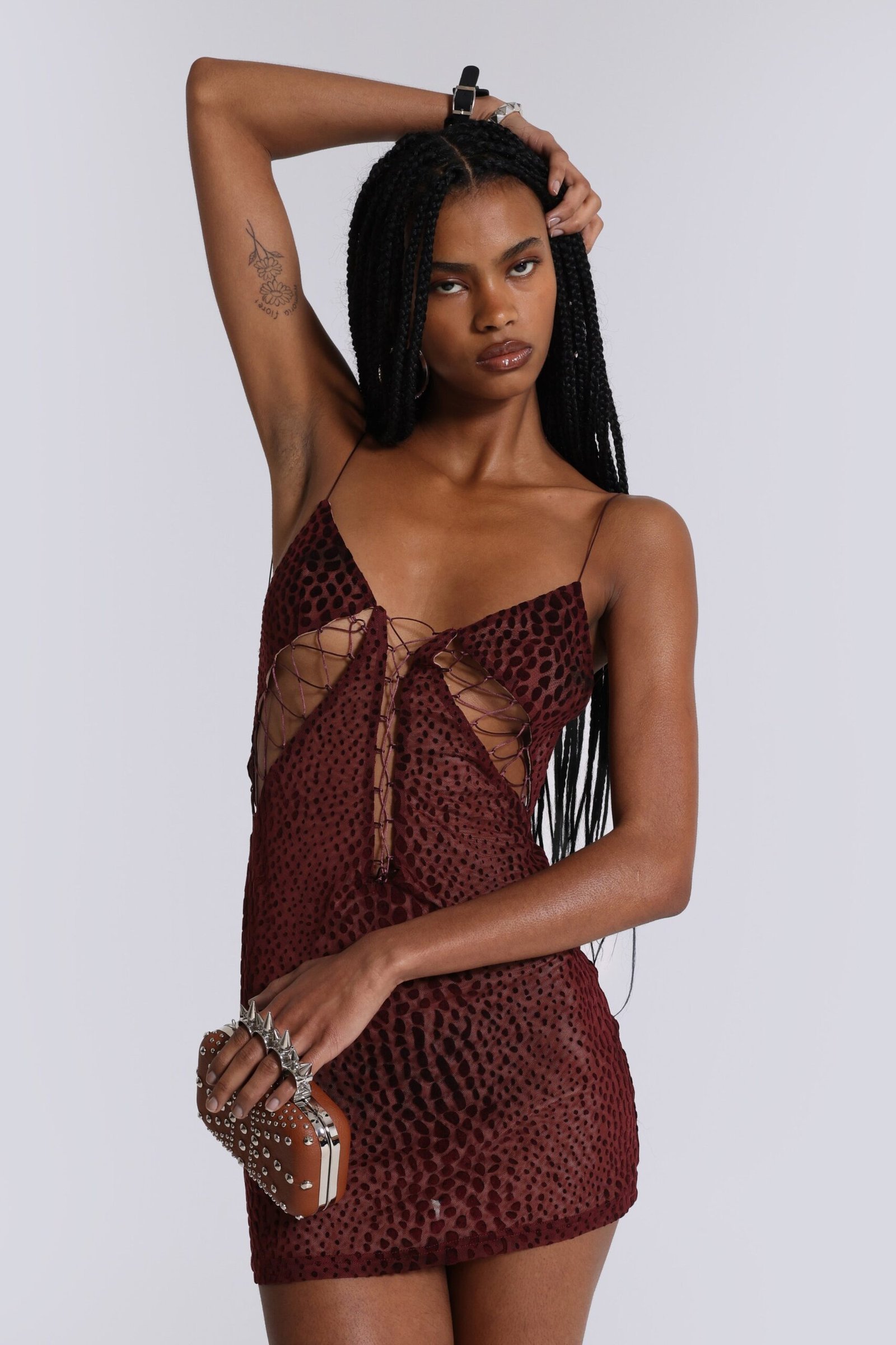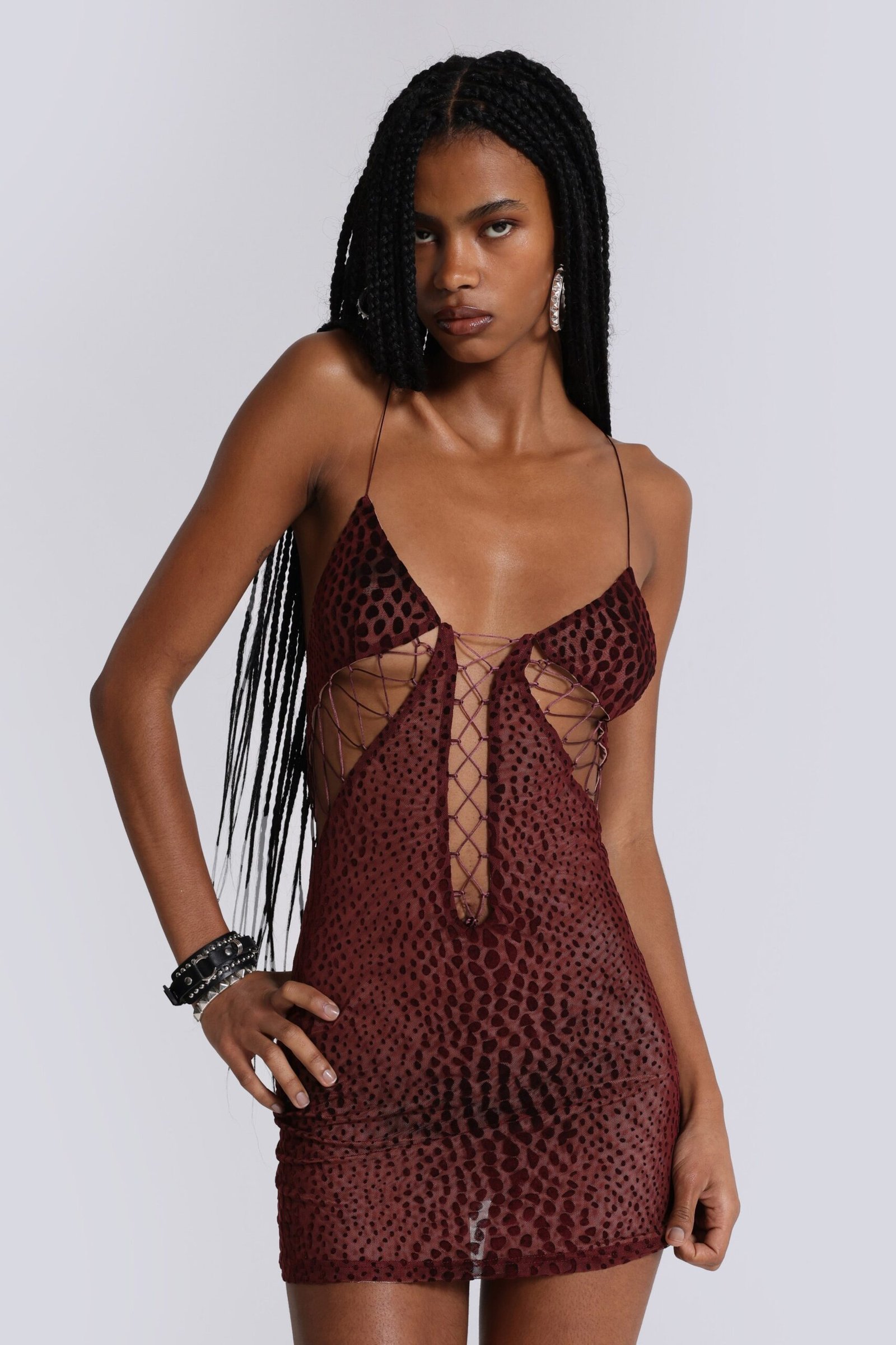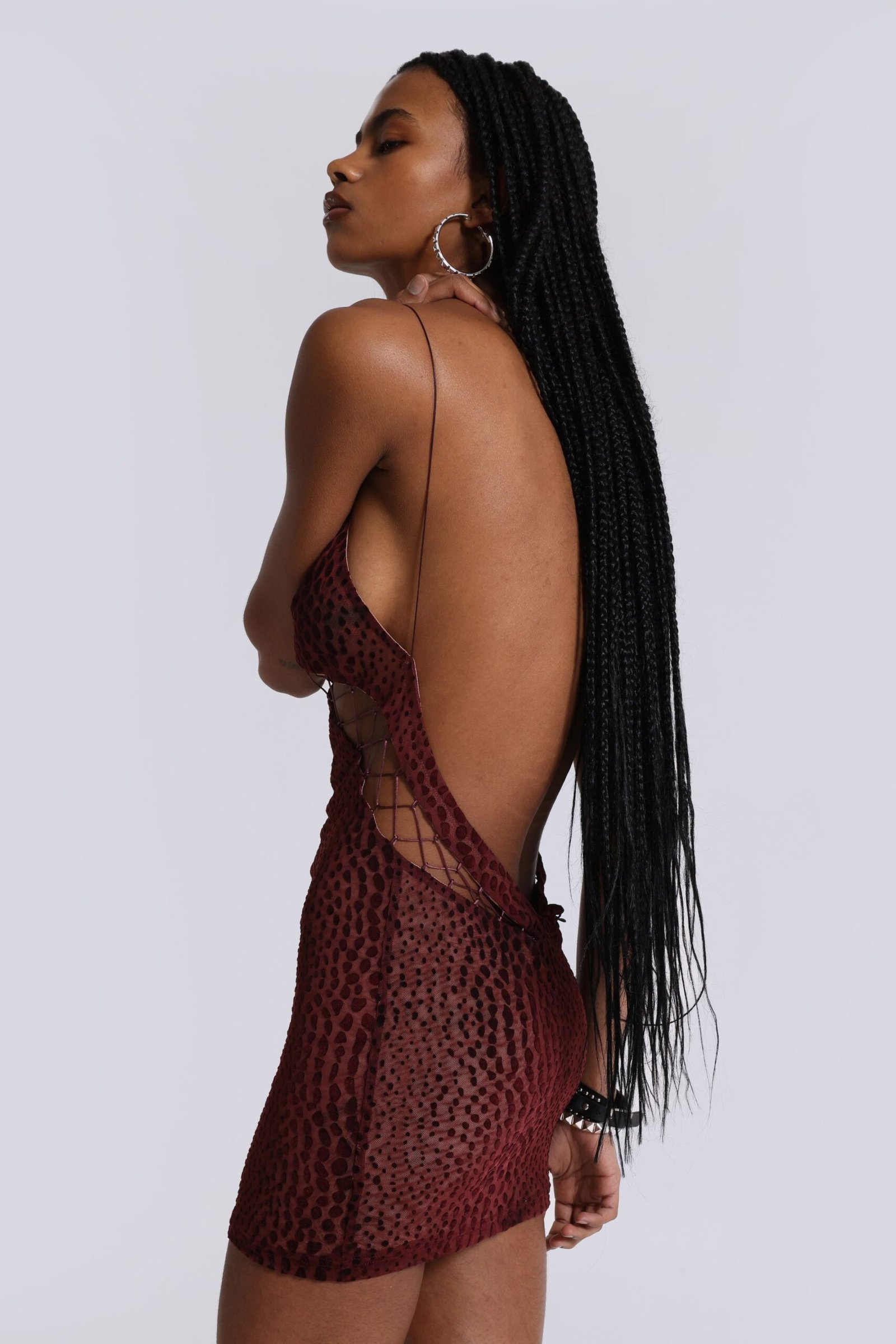 This croc-effect lace-up mini dress features a fully lined burgundy fabric. The front showcases a low cut-out with adjustable lace-up detailing, mirrored by lace-up cut-outs at the sides. An open back complete the striking, sculpted silhouette.