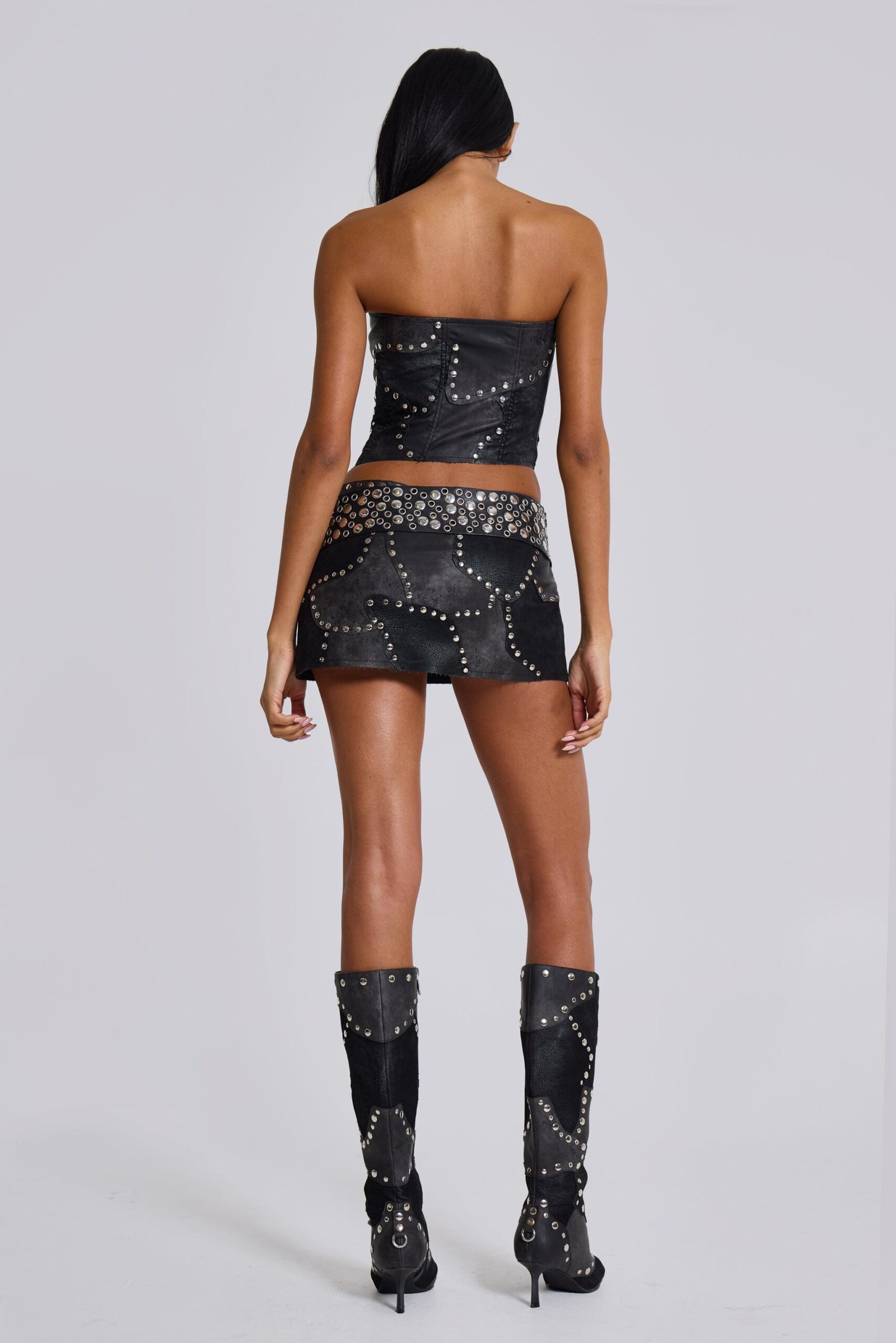 Shadow Studded Corset Top. Pu and faux suede panelled asymmetric corset with stud detailing around each panel. Studs are of varying size in silver colour.