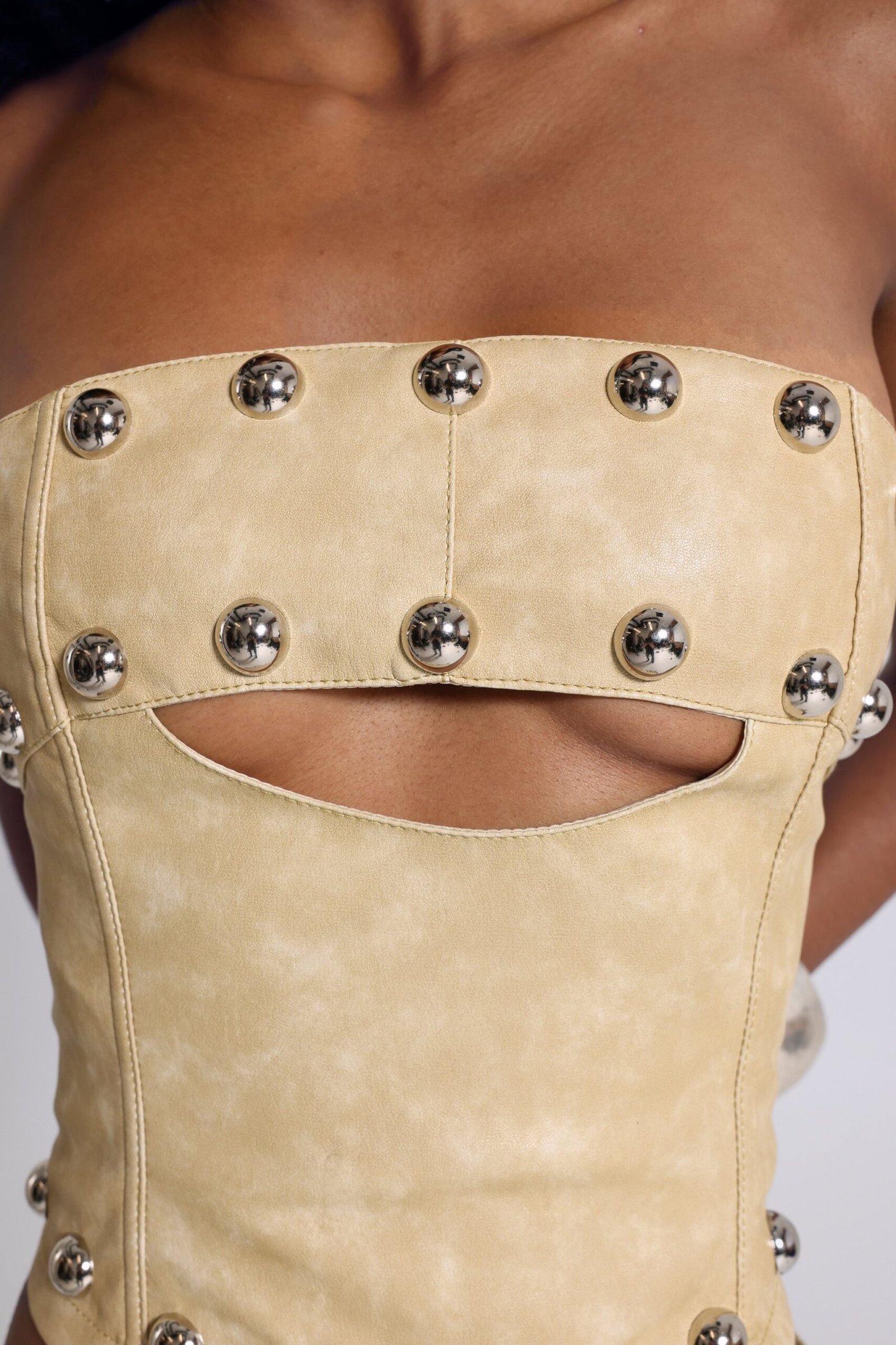 This faux leather studded corset features a fitted bandeau corset design in faux cream leather, detailed with oversized shiny silver studs. Cut-out accents, princess seams and a curved hemline add shape, with structure coming from a lined front and back and zip closure.